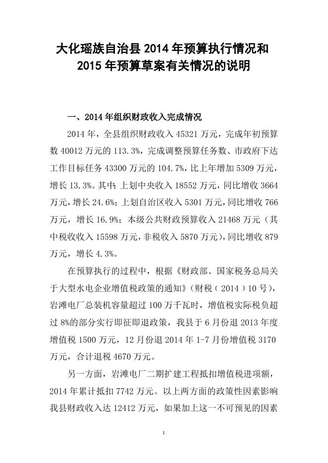 2.大化县2014年预算执行情况和2015年预算草案有关情况的说明 (人大).doc