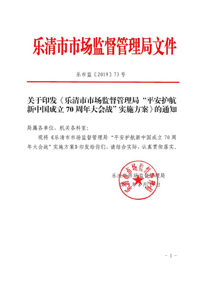 乐市监〔2019〕73号——关于印发《乐清市市场监督管理局“平安护航新中国成立70周年大会战”实施方案》的通知.pdf