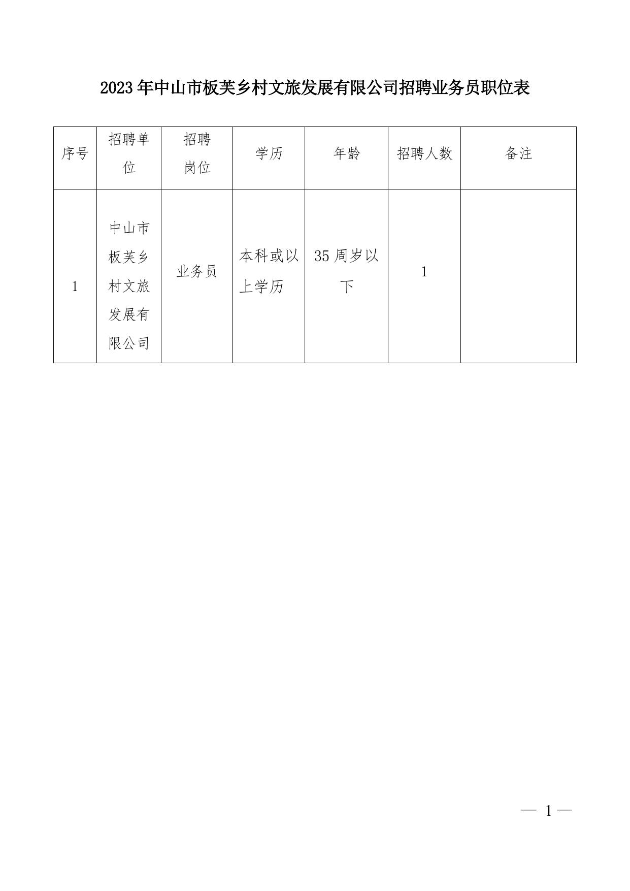 2023年中山市板芙乡村文旅发展有限公司招聘业务员职位表.doc