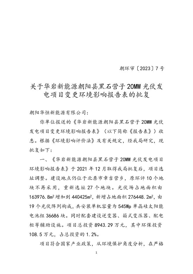 关于华岩新能源朝阳县黑石营子20MW光伏发电项目变更环境影响报告表的批复(朝环审〔2023〕7号).doc