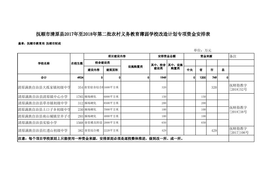 抚顺市清原县2017年至2018年第二批农村义务教育薄弱学校改造计划专项资金安排表 (1).xls