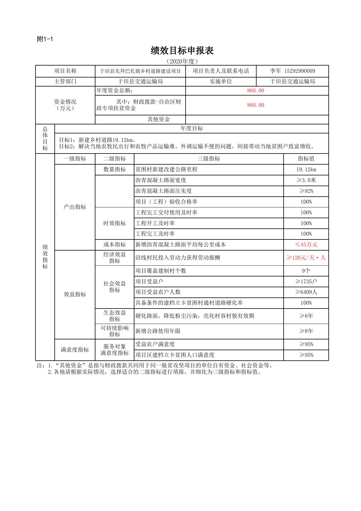 于田县先拜巴扎镇乡村道路建设项目 绩效目标申报表.xlsx
