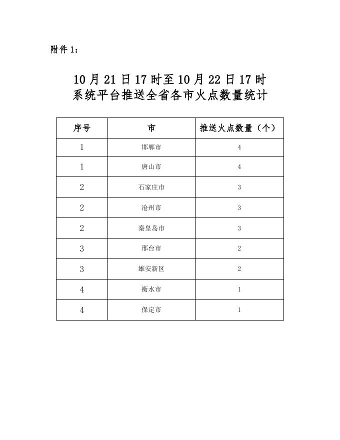 附件1:10月21日17时至10月22日17时系统平台推送全省各市火点数量.doc