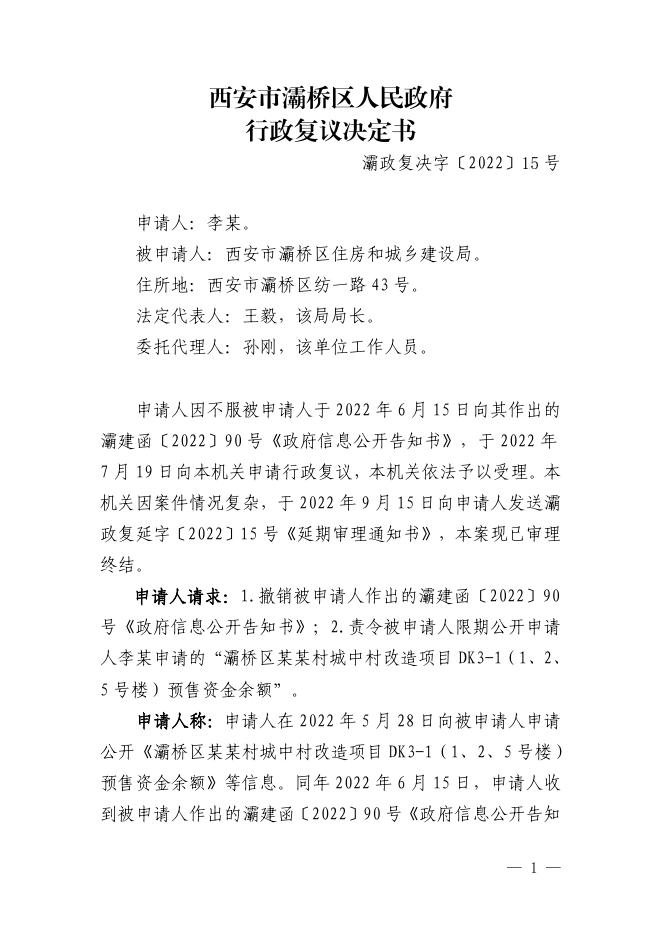 李某不服政府信息公开《行政复议决定书》灞政复决字〔2022〕15号.pdf
