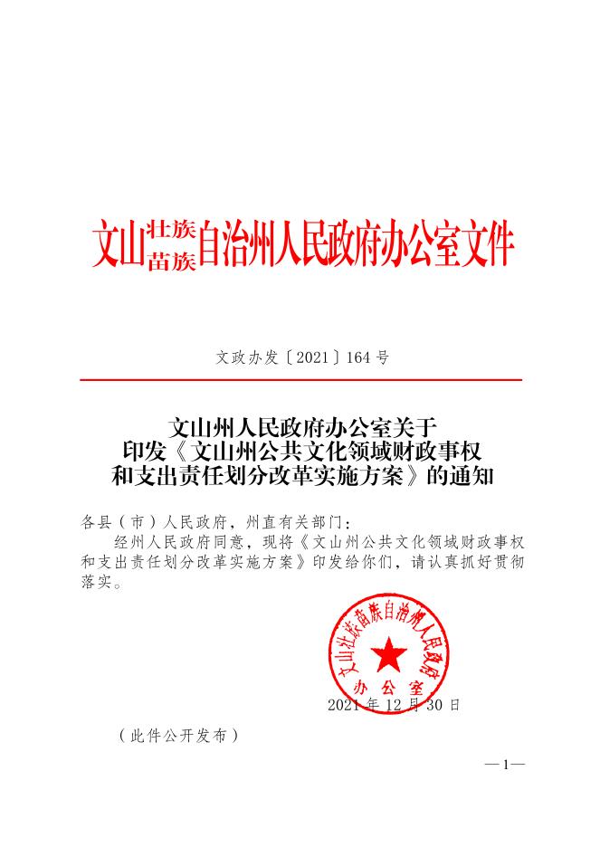 文山州人民政府办公室关于印发《文山州公共文化领域财政事权和支出责任划分改革实施方案》的通知(文政办发〔2021〕164号)(1).pdf