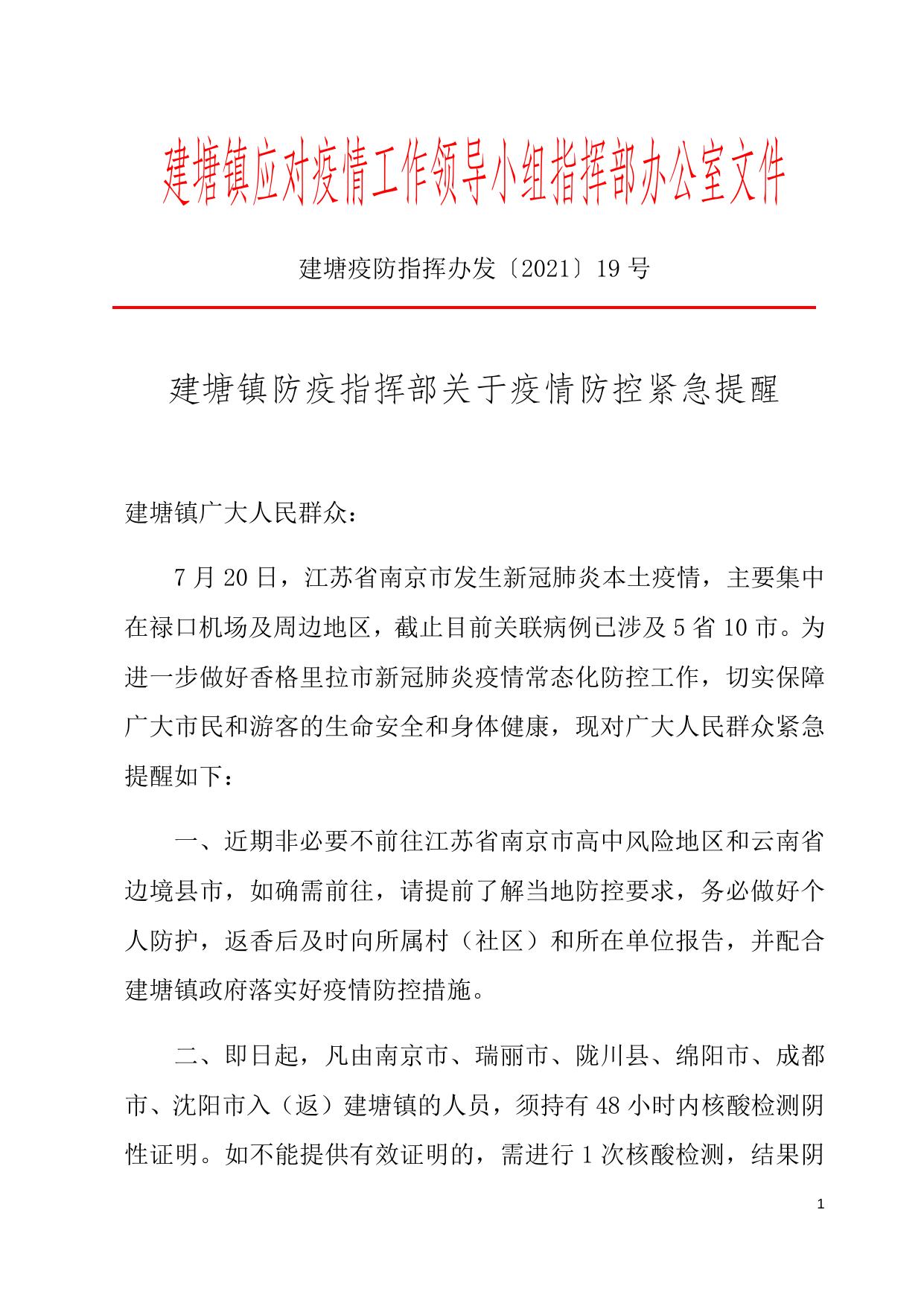 建塘防疫指挥办发2021【19】建塘镇防疫指挥部关于疫情防控紧急提醒.docx