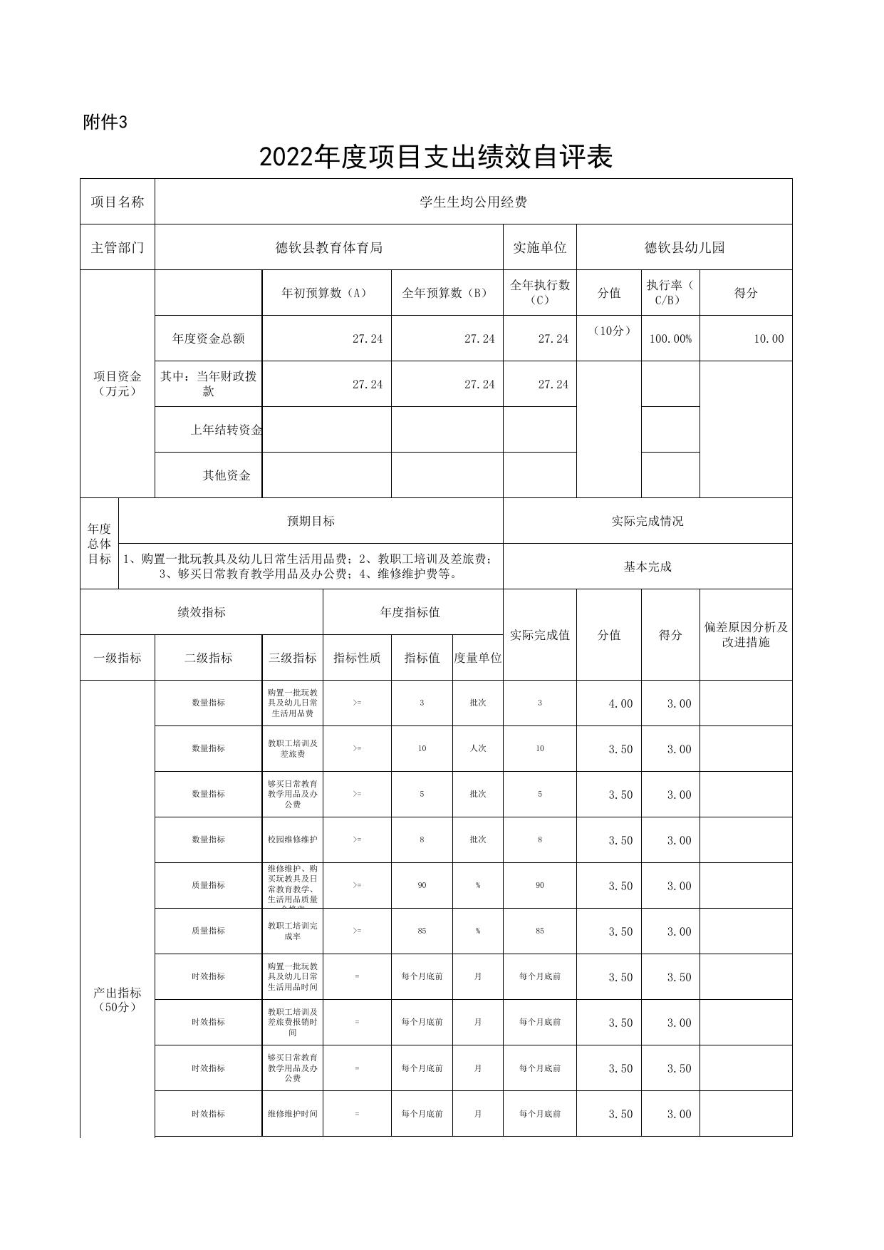 附件3:德钦县幼儿园生均公用经费项目2022年度绩效自评表.xls