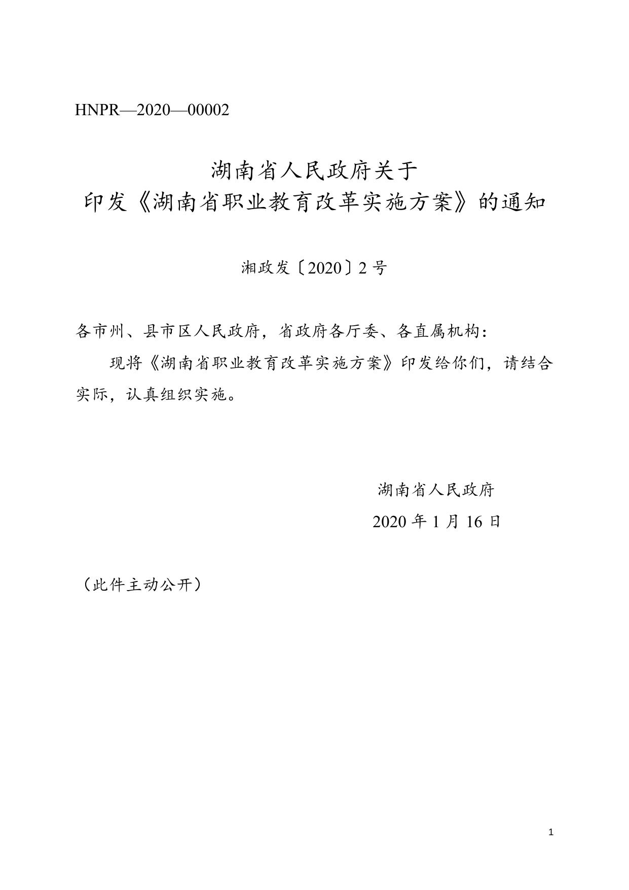 【湘政发2号】湖南省人民政府关于印发《湖南省职业教育改革实施方案》的通知.doc