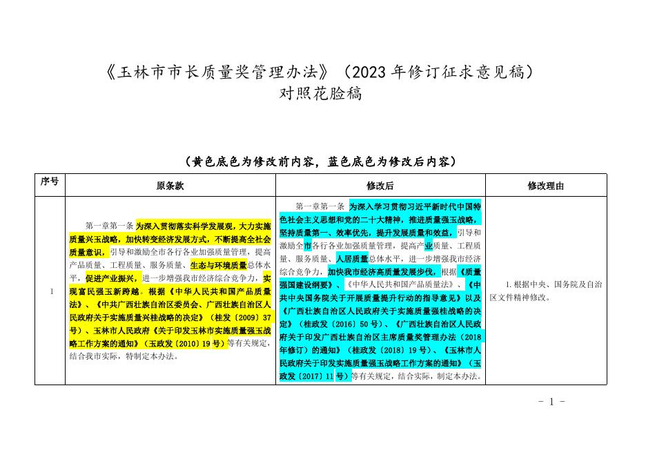 附件2:《玉林市市长质量奖管理办法》(修订征求意见稿)对照花脸稿.doc