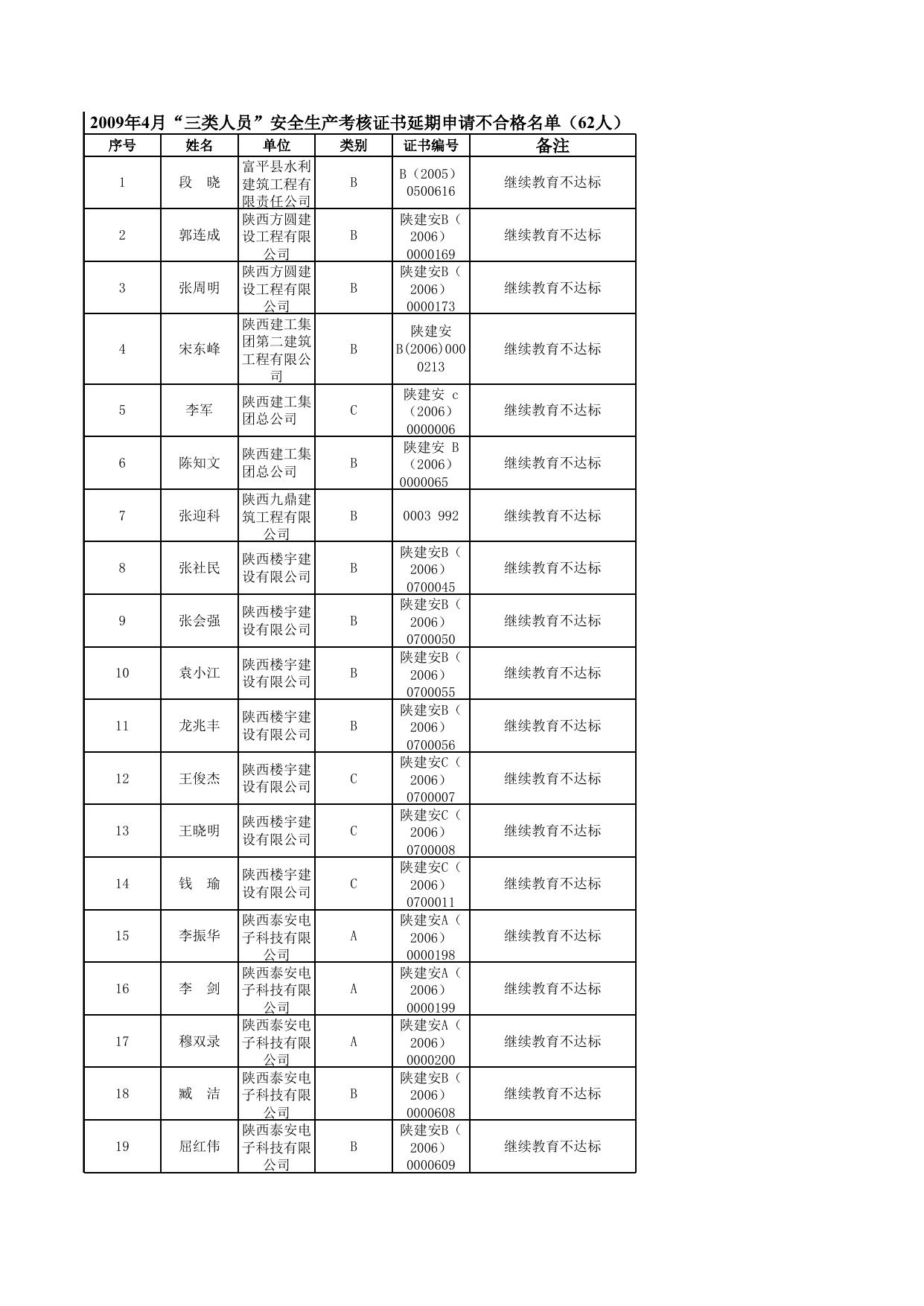 附件四:建筑施工企业“三类人员”安全生产考核证书延期不合格人员名单(62人).xls