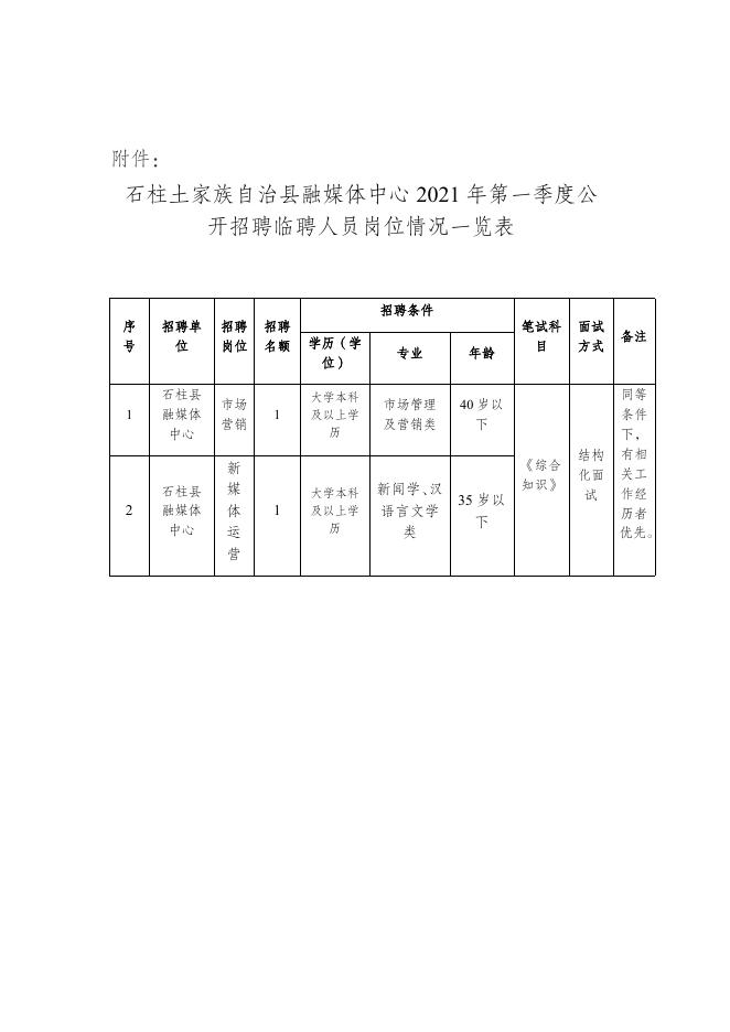 附件:石柱土家族自治县融媒体中心2021年第一季度公开招聘临聘人员岗位情况一览表.docx