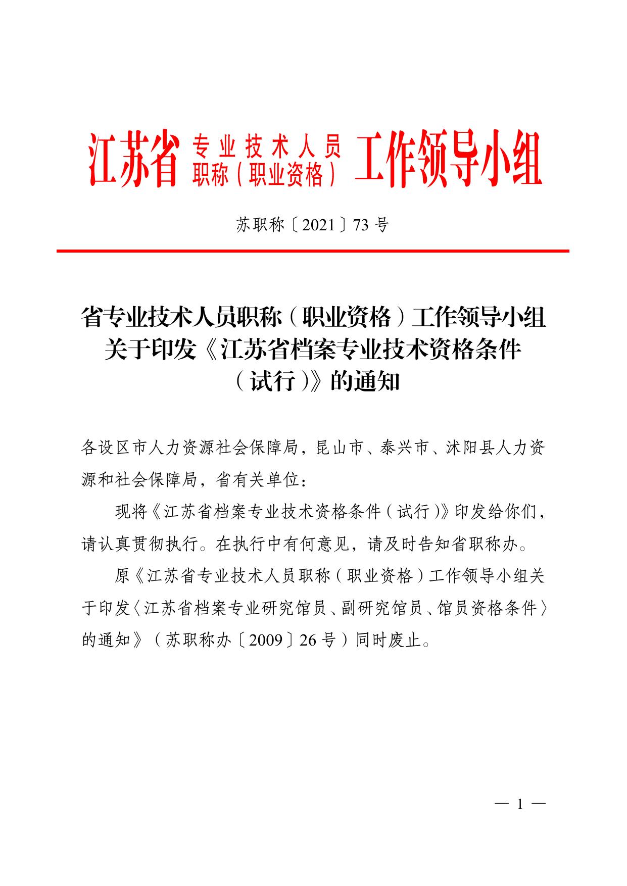 苏职称〔2021〕73 号__省专业技术人员职称(职业资格)工作领导小组__关于印发《江苏省档案专业技术资格条件__(试行)》的通知.pdf