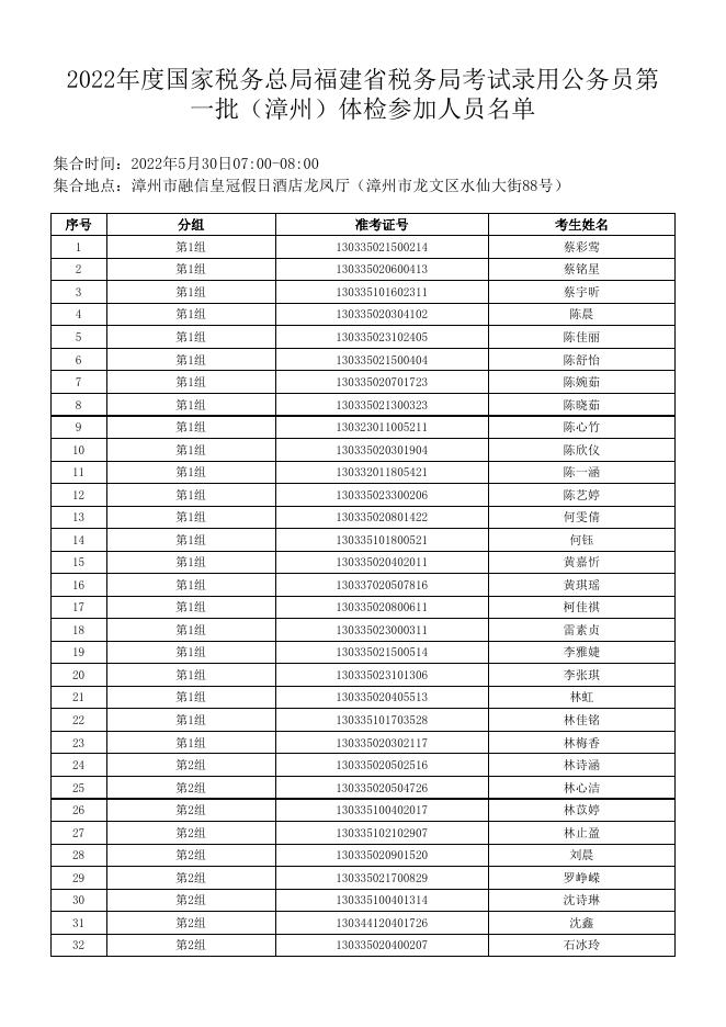 2022年度国家税务总局福建省税务局考试录用公务员第一批(漳州)体检参加人员名单.xlsx