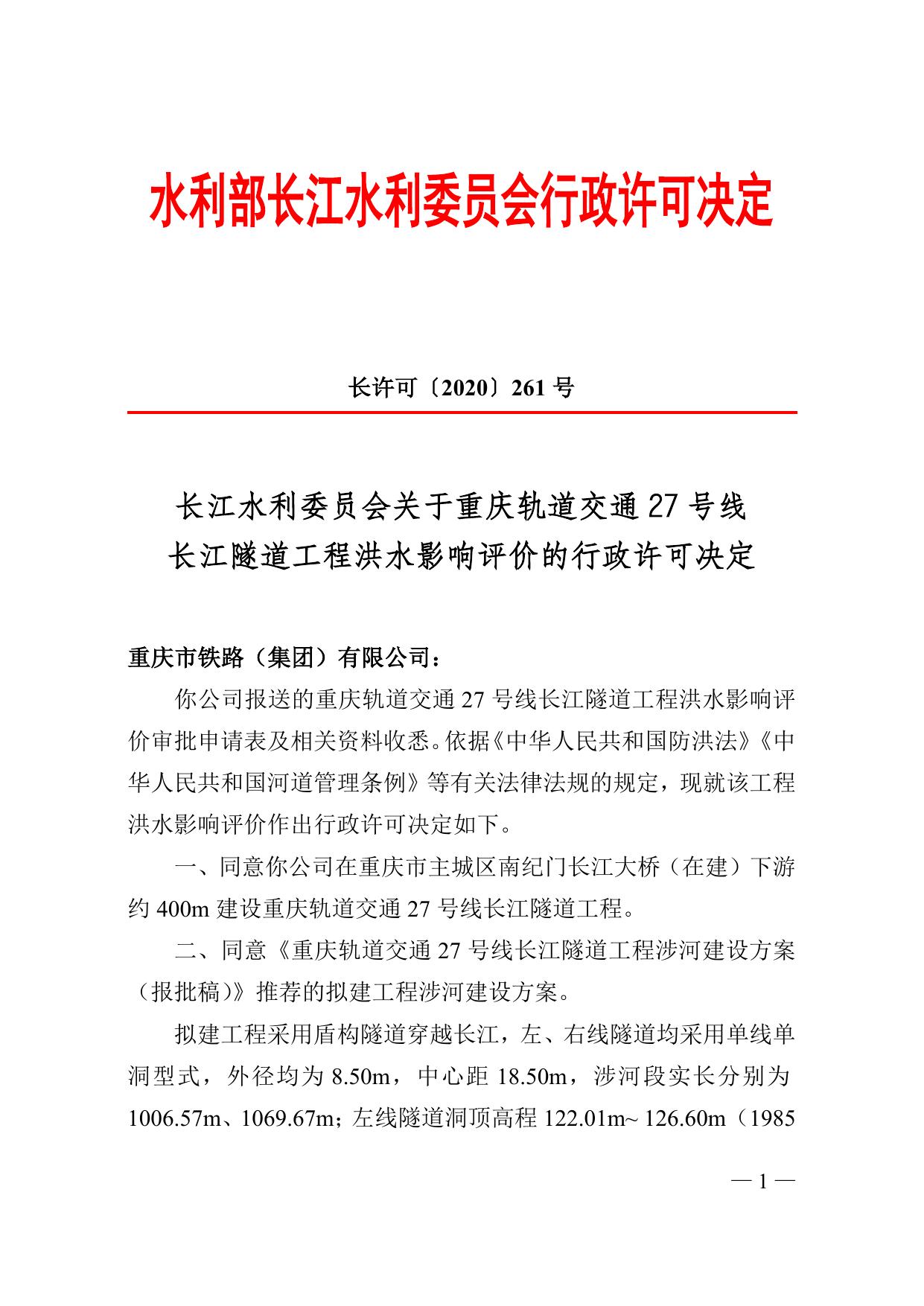 长江水利委员会关于重庆轨道交通27号线长江隧道工程洪水影响评价的行政许可决定.doc