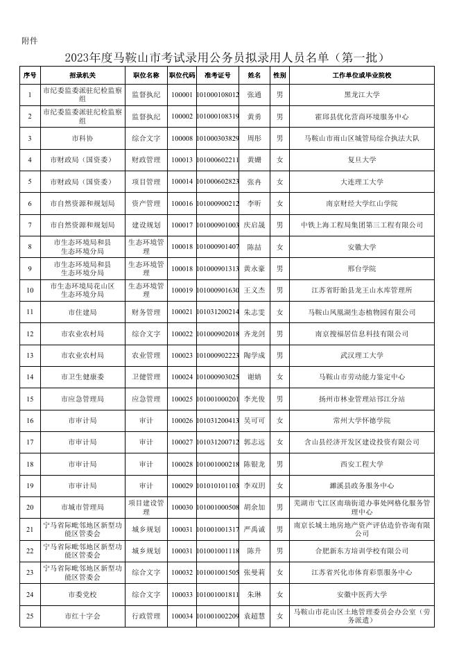 2023年度马鞍山市考试录用公务员拟录用人员名单(第一批).xlsx