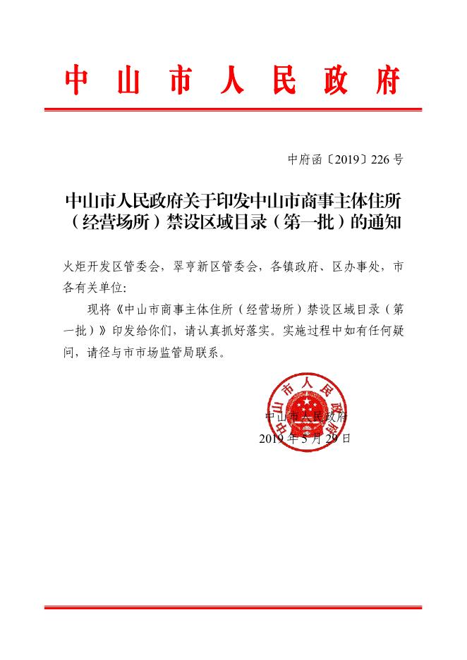 中山市人民政府关于印发中山市商事主体住所(经营场所)禁设区域目录(第一批)的通知.pdf