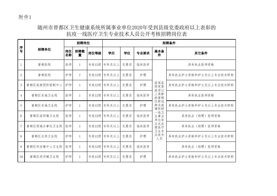 附件1:曾都区2020年受到县级党委政府以上表彰抗疫一线医疗卫生专业技术人员考核招聘岗位表.xls