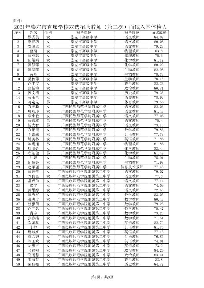 1.2021年崇左市直属学校双选招聘教师(第二次)面试入围体检人员名单.xlsx