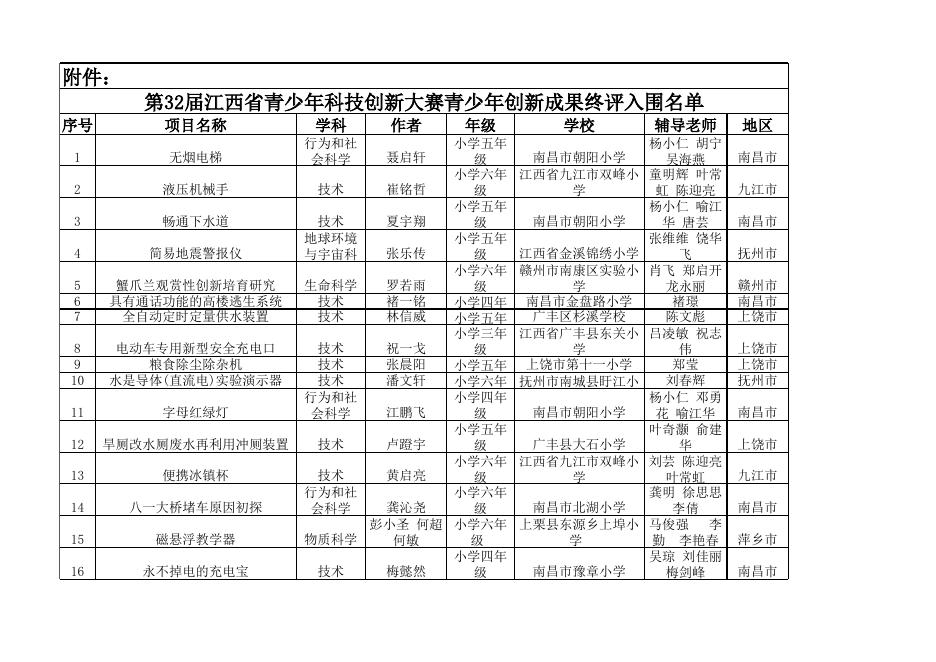 附 件 : 第32届江西省青少年科技创新大赛青少年创新成果竞赛终评入围名单.xls