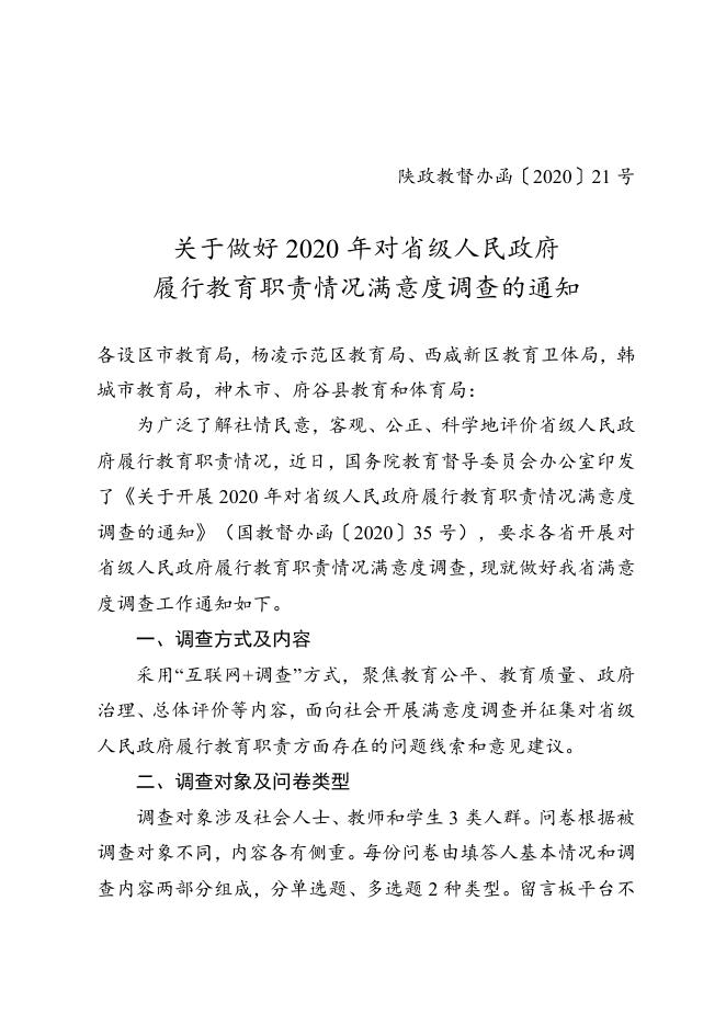 5_陕政教督办函[2020]21号-关于开展2020年对省级人民政府履行教育职责情况满意度调查的通知.docx