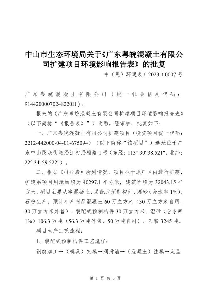 中山市生态环境局关于广东粤皖混凝土有限公司扩建项目环境影响报告表的批复-(中(民)环建表﹝2023﹞0007号).pdf