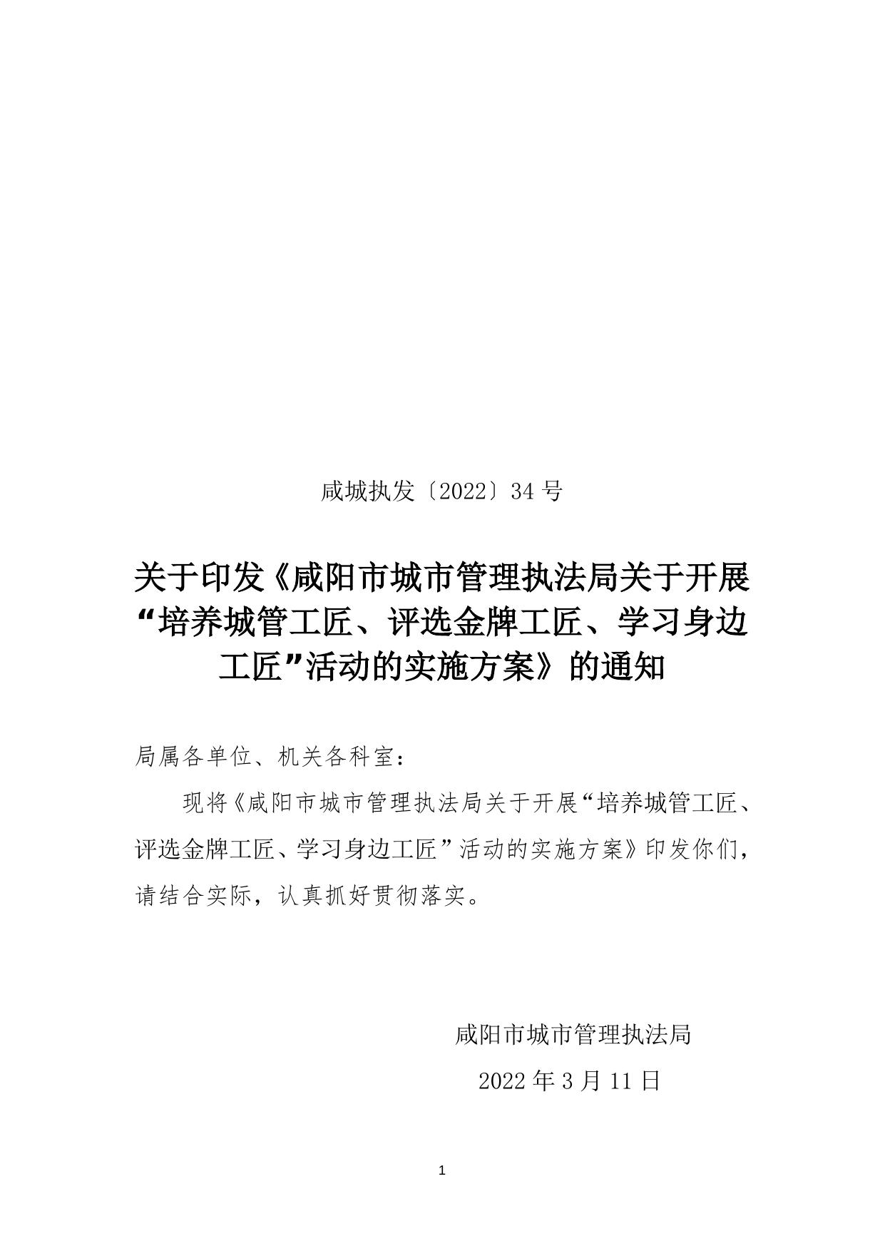 关于印发《咸阳市城市管理执法局关于开展“培养城管工匠、评选金牌工匠、学习身边工匠”活动的实施方案》的通知 2023-02-13.docx
