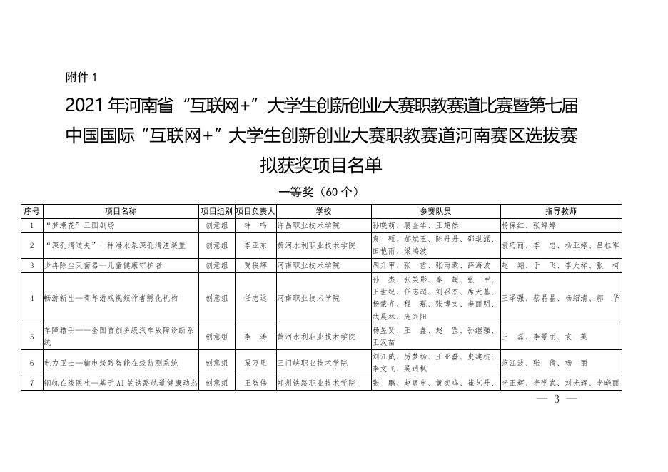 1.2021年河南省“互联网+”大学生创新创业大赛职教赛道比赛暨第七届中国国际“互联网+”大学生创新创业大赛职教赛道河南赛区选拔赛拟获奖项目名单.pdf
