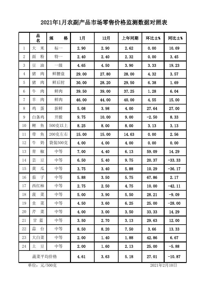 2021年1月份农副产品市场零售价格监测数据统计对照表.xls
