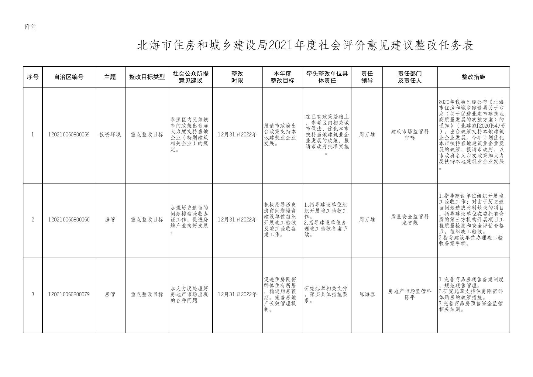 附件:北海市住房和城乡建设局2021年度社会评价意见建议整改任表.xlsx
