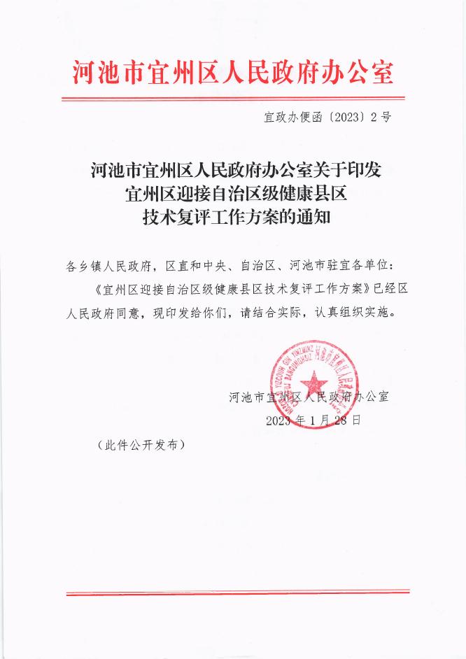 宜政办便函〔2023〕2号 河池市宜州区人民政府办公室关于印发宜州区迎接自治区级健康县区技术复评工作方案的通知.pdf