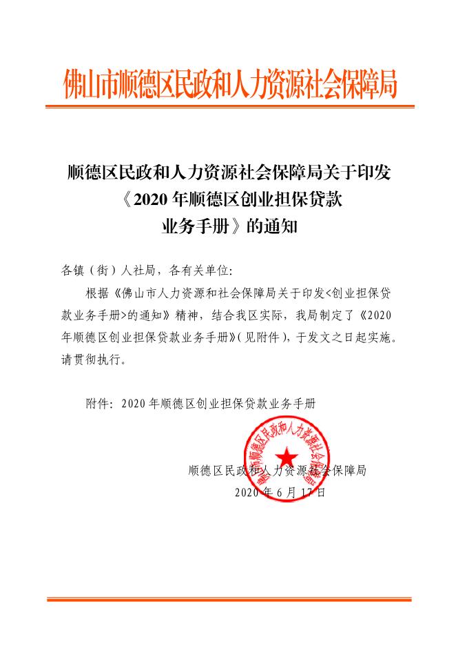 顺德区民政和人力资源社会保障局关于印发《2020年顺德区创业担保贷款业务手册》的通知.pdf