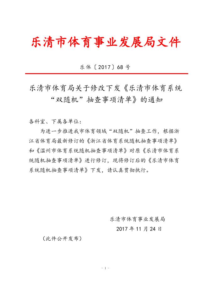乐清市体育局关于修改下发《乐清市体育系统随机抽查事项清单》的通知.docx