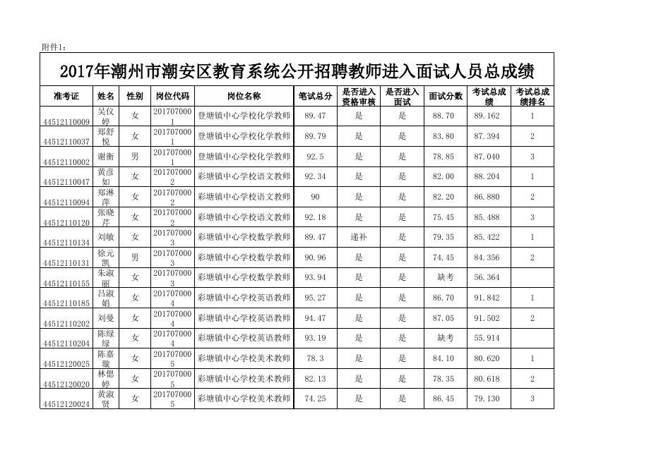 、《2017年潮州市潮安区教育系统公开招聘教师进入面试人员总成绩》.xlsx