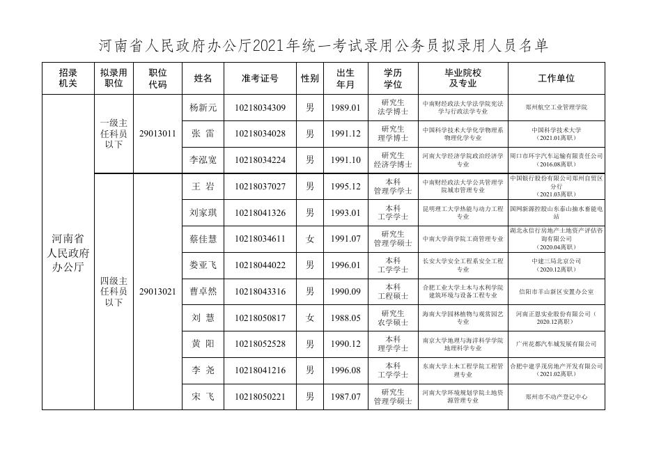 河南省人民政府办公厅2021年统一考试录用公务员拟录用人员名单.xls