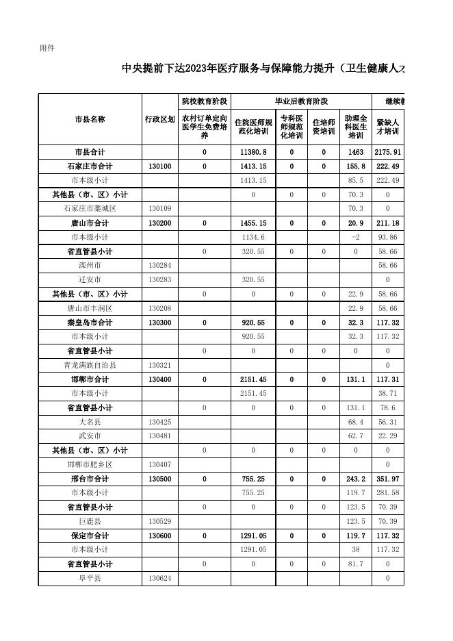 附件:中央提前下达2023年医疗服务与保障能力提升(卫生健康人才培养)补助资金市县分配表.xlsx