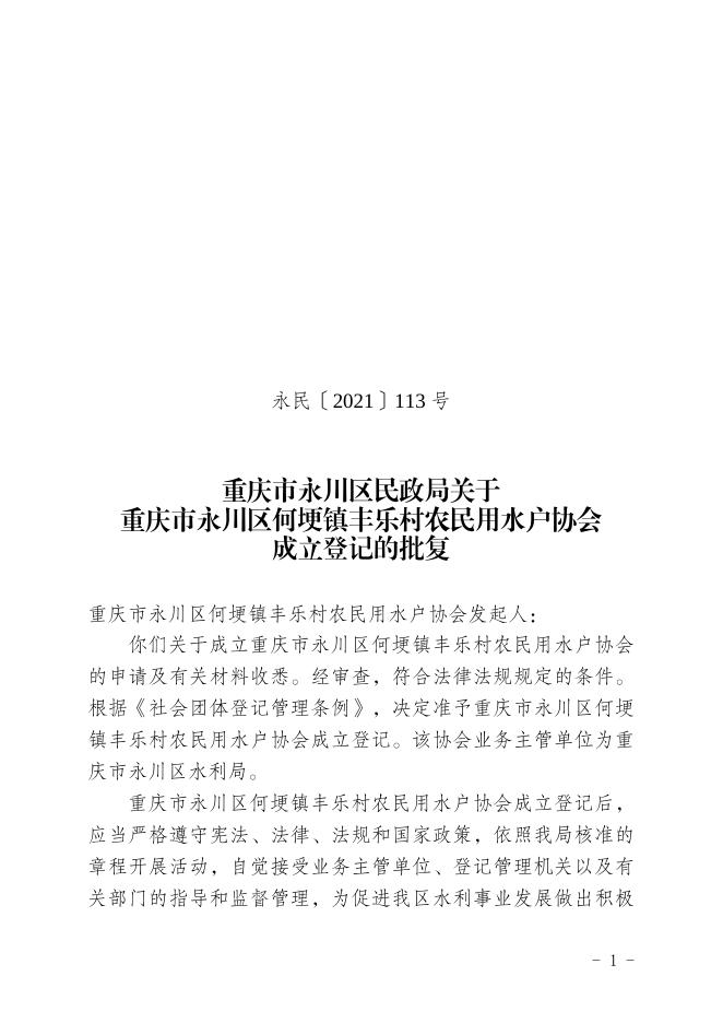 永民〔2021〕113号重庆市永川区何埂镇丰乐村农民用水户协会成立登记的批复.doc