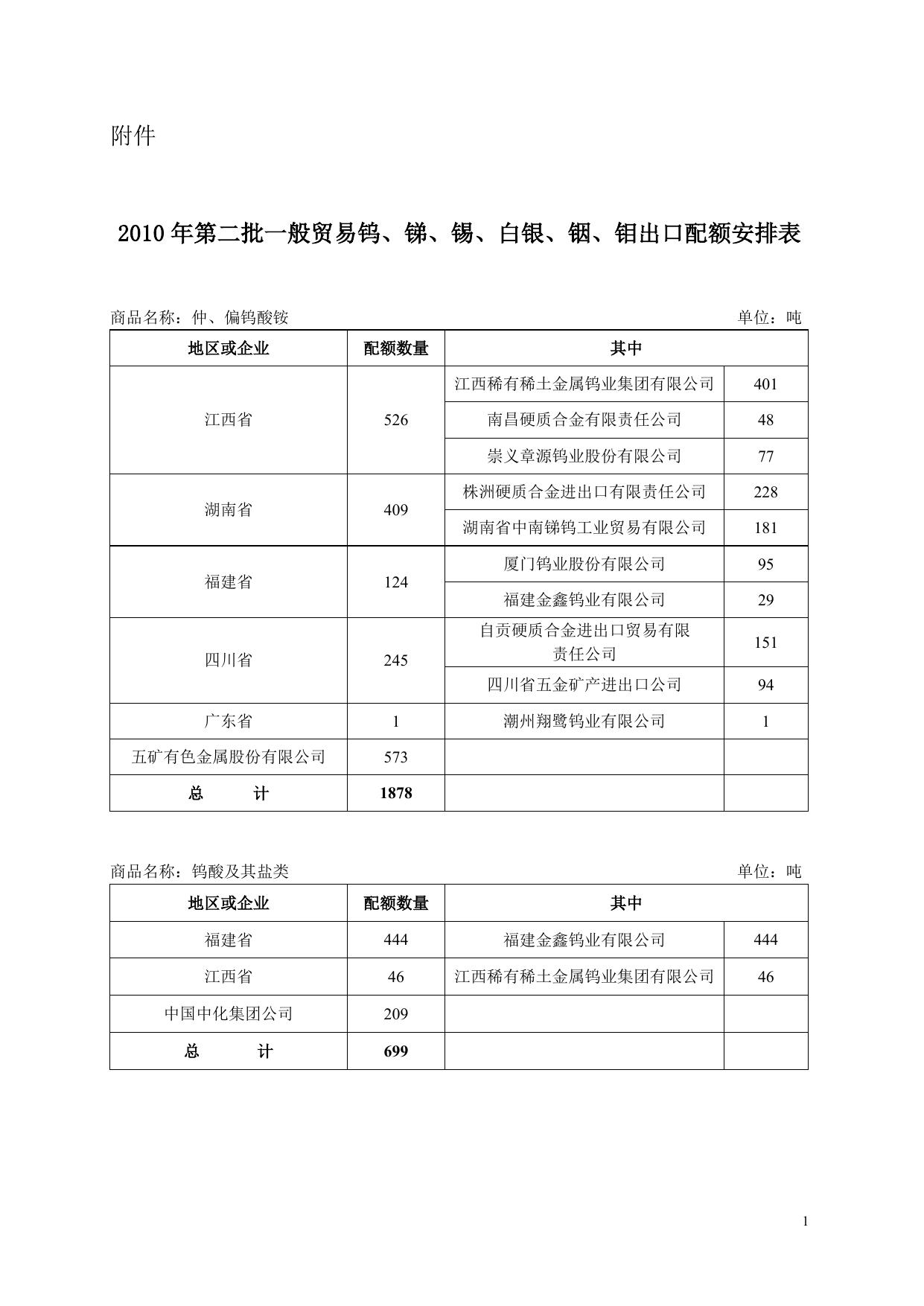 2010年第二批一般贸易钨、锑、锡、白银、铟、钼出口配额安排表.doc