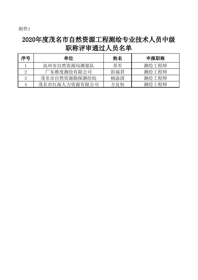 1、2020年度茂名市自然资源工程测绘专业技术人员中级职称评审通过人员名单.xlsx