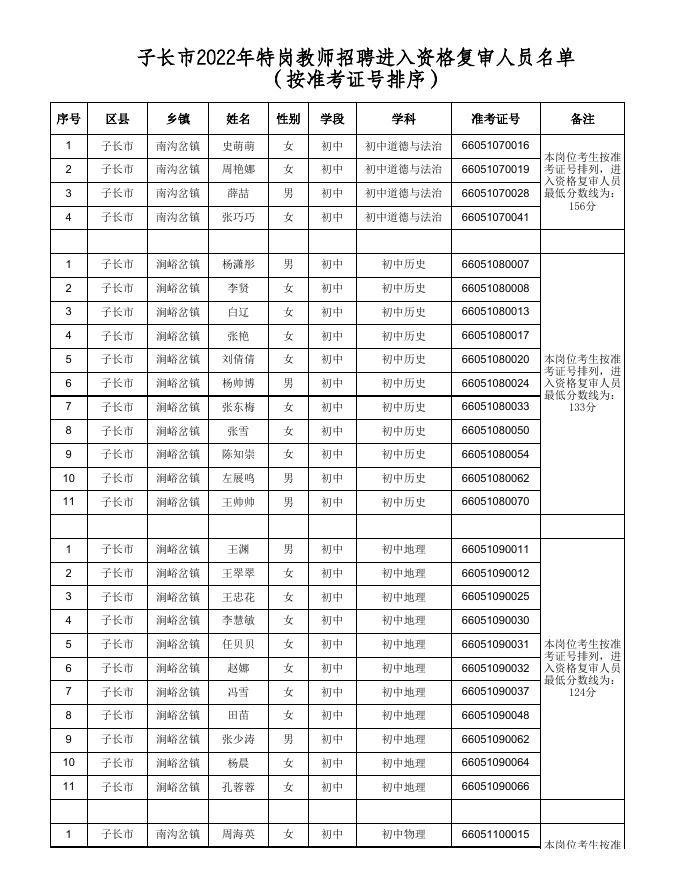 附件1:子长市2022年特岗教师招聘进入资格复审人员名单 (按准考证号排序).xls