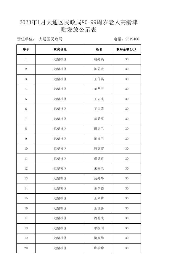 2023年1月大通区80-99周岁高龄老人高龄津贴发放公示表.xlsx