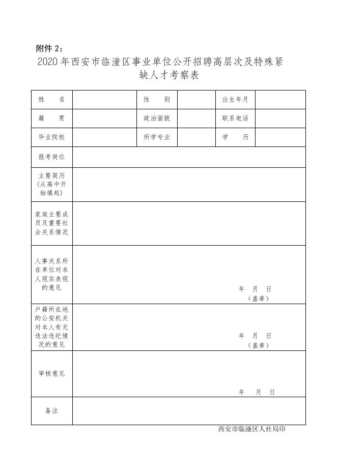 2020年西安市临潼区事业单位公开招聘高层次及特殊紧缺人才考察表.doc