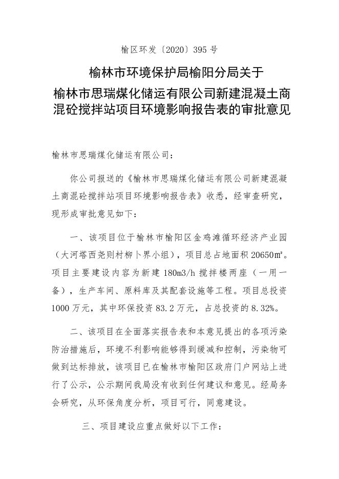 2020.12.30关于榆林市思瑞煤化储运有限公司新建混凝土商混砼搅拌站项目环境影响报告表的审批意见.docx