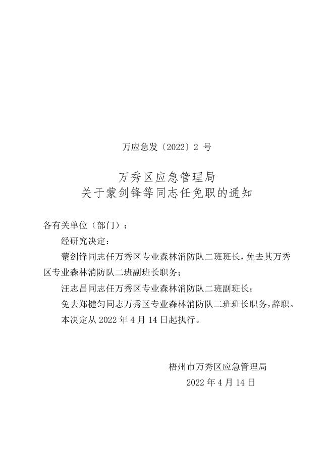 万秀区应急管理局关于蒙剑锋等同志任免职的通知(万应急发〔2022〕2号).doc