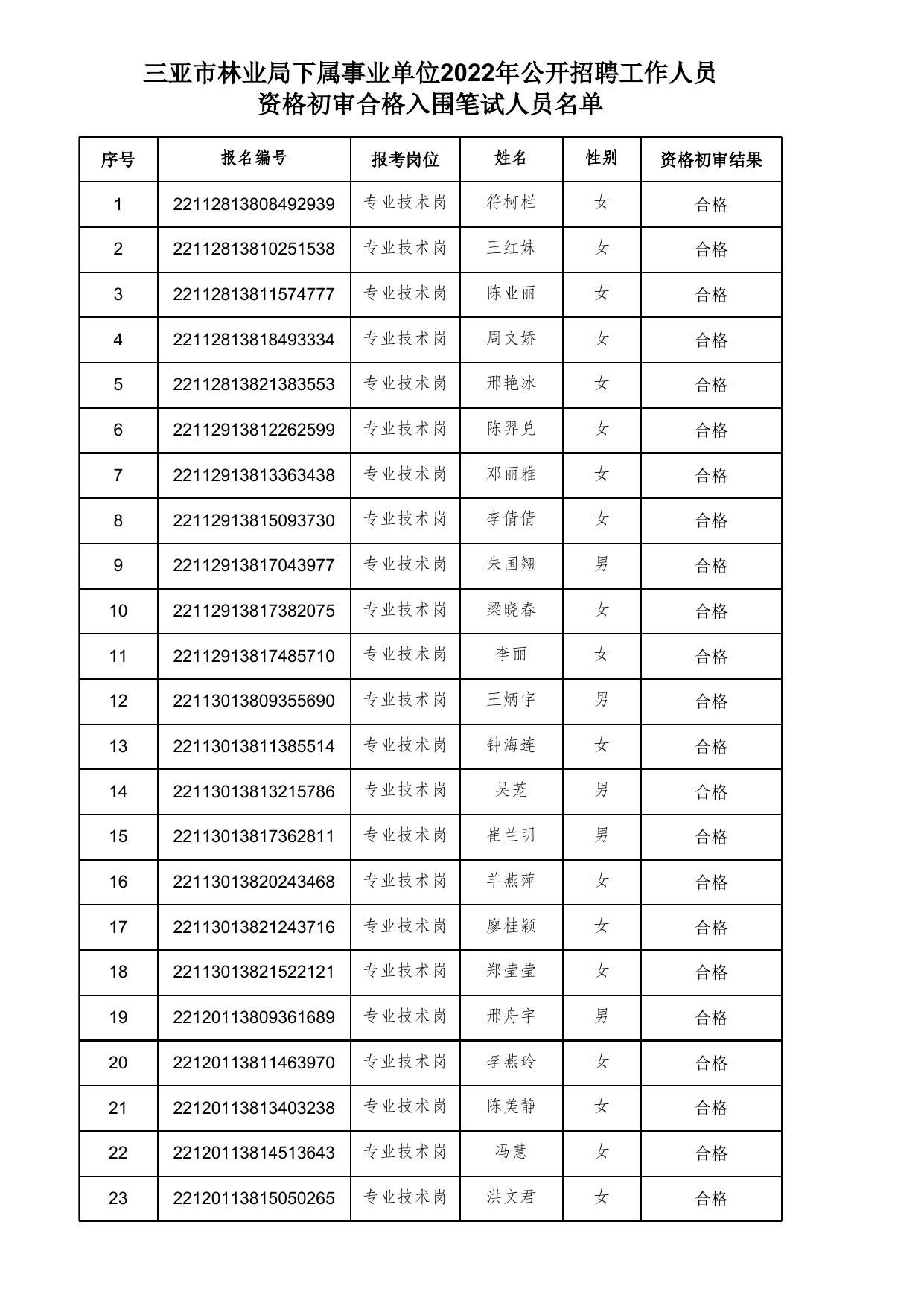 附件:1.三亚市林业局下属事业单位2022年公开招聘工作人员资格初审合格入围笔试人员名单.xlsx