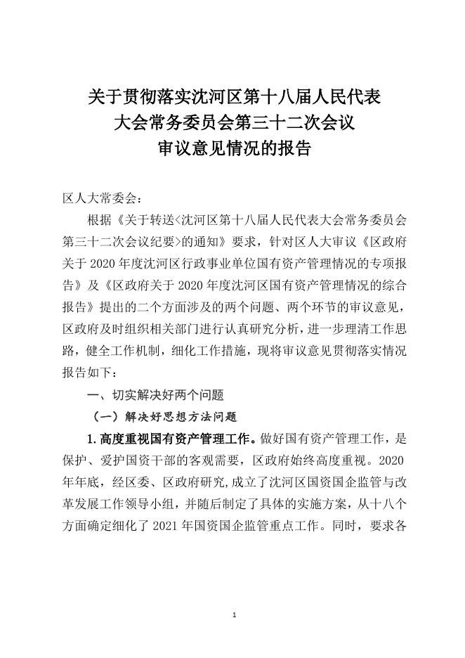 关于贯彻落实沈河区第十八届人民代表大会常务委员会第三十二次会议审议意见情况的报告.doc