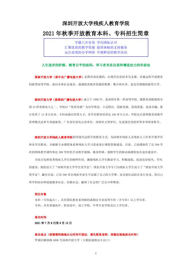 深圳开放大学残疾人教育学院2021秋招生简章.doc