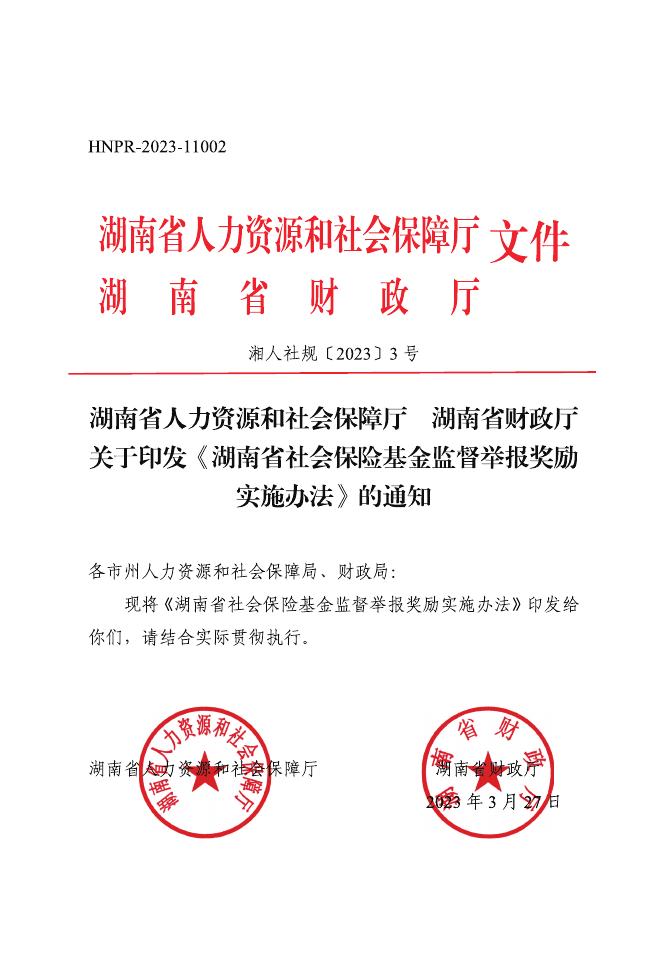 政策原文:湖南省人力资源和社会保障厅 湖南省财政厅关于印发《湖南省社会保险基金监督举报奖励实施办法》的通知.pdf