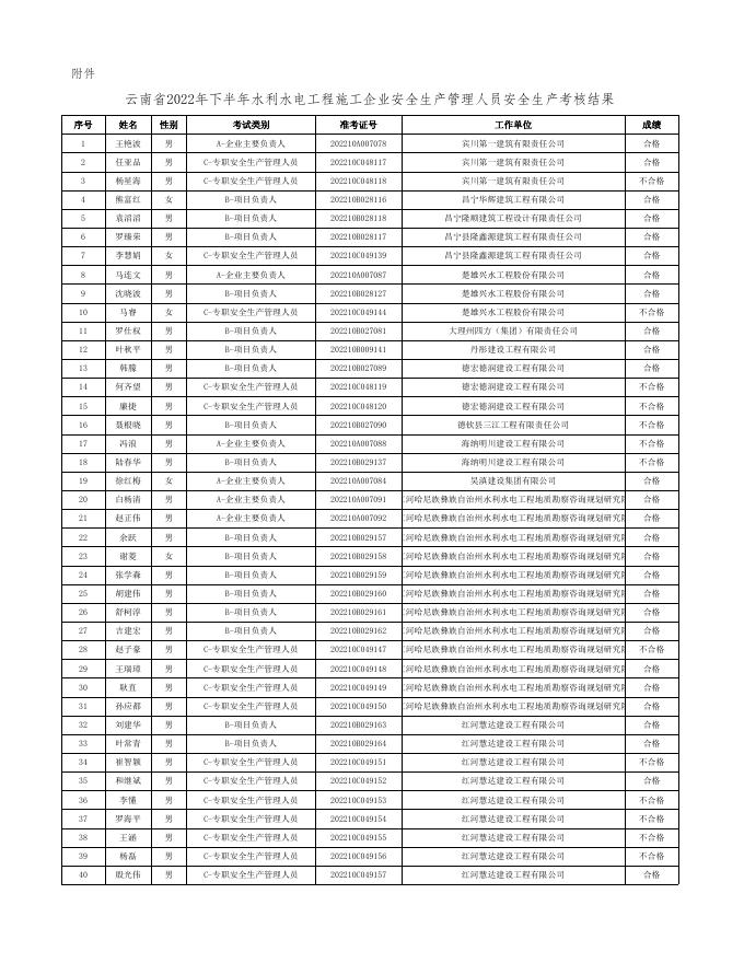 云南省2022年下半年水利水电工程施工企业安全生产管理人员安全生产考核结果.xls