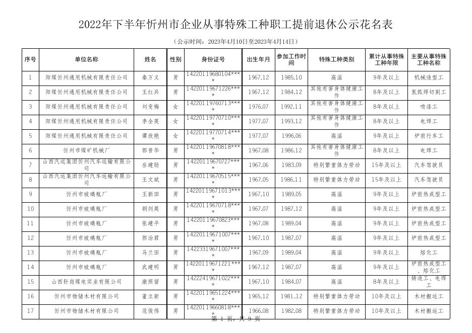 2022年下半年忻州市企业从事特殊工种职工提前退休公示花名表.xlsx