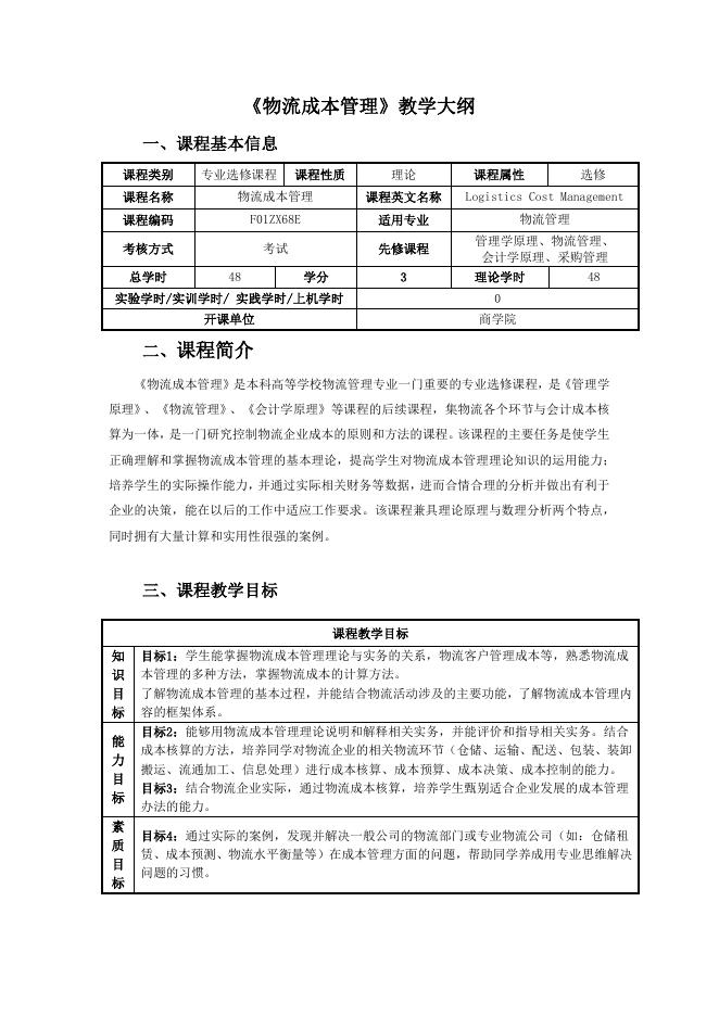 2018版4、6、8学期专业拓展选修课程《物流成本管理》教学大纲_物流管理专业_东莞理工学院城市学院商学院.docx